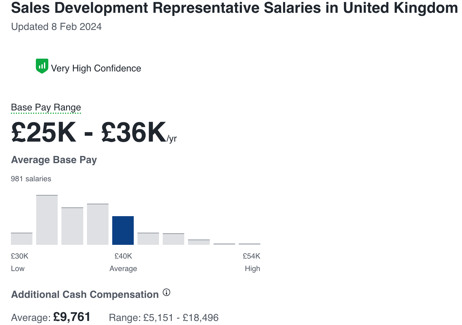 As per the above image, the average salary for a Sales Development Representative (aka, ‘SDR’) is £39,000/year in the UK (around $50,000 in U.S. dollars).